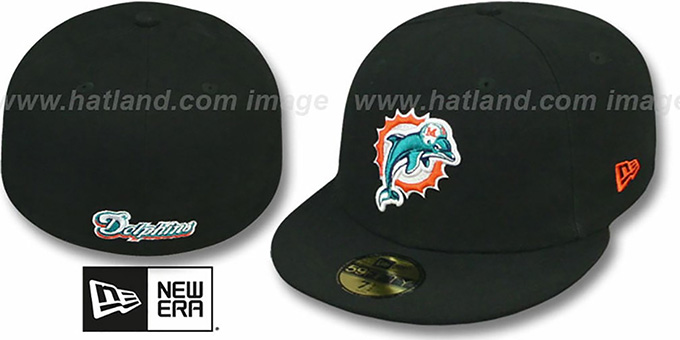 Authentic and ORIGINAL 59Fifty fitted hat by New Era, black authentic poly deep crown with the high tech fabric that has revolutionary wicking ability, superior drying, and is shrink resistant, black visor and undervisor, raised embroidered team logo on front, embroidered secondary team logo font on back. This Miami Dolphins hat is made by New Era and is licensed by the NFL National Football League.