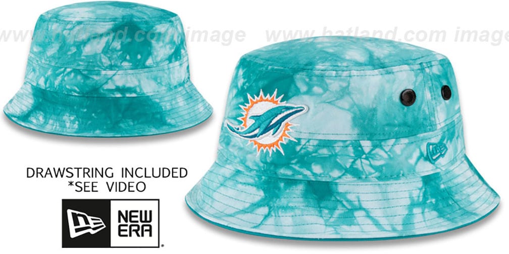 Fitted cotton Bucket hat by New Era, pastel aqua and white tye-dye Hi-Res print crown and brim, aqua undervisor, raised embroidered team logo on front, no logo on back, black adjustable and removable string, Adult approximate sizing: S - 7 1/8-7 1/4, M 7 1/4-7 3/8, L 7 3/8-7 1/2, XL 7 1/2-7 5/8, XXL 7 5/8-7 3/4, EACH TYE-DYE PATTERN WILL BE SLIGHTLY DIFFERENT SO NO TWO BUCKETS WILL BE THE SAME. This Miami Dolphins hat is made by New Era and is licensed by the NFL - National Football League.