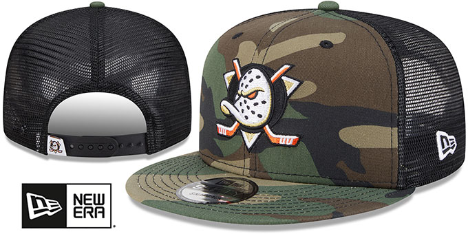 Original 9FIFTY fit adjustable poly meshback hat by New Era that has similar deep crown and flat brim fit as the 59-Fifty, army (woodland) camo cotton front panels and visor with black mesh middle and back panels, light grey undervisor, raised embroidered team logo on front in team colors, embroidered white New Era logo on side, black adjustable snapback closure with team logo hangtag. This Anaheim Ducks hat is made by New Era and is licensed by the NHL - National Hockey League.