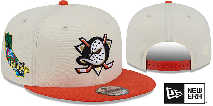 Original 9FIFTY adjustable poly hat by New Era that has similar deep crown and flat brim fit as the 59-Fifty, chrome (cream off white) crown with orange visor, kelly green undervisor, raised embroidered team logo on front in team colors, embroidered New Era logo on side, embroidered Localized California state logo on side, team color adjustable Snapback closure. This Anaheim Ducks hat is made by New Era and is licensed by the NHL - National Hockey League.