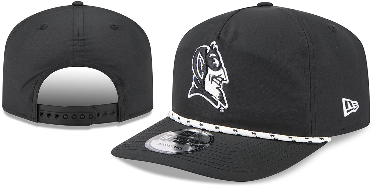 This 19TWENTY adjustable hat by New Era has a relaxed fit crown with pinched front panel construction and a mesh tray insert for light support. It has a poly nylon black crown and squared edge pre-curved visor with a black and white rope along brim. The undervisor is light grey, and the front sports a raised embroidered team logo in black and white. The side displays a matching embroidered New Era flag, and the back has an adjustable black rubber Snapback closure.. This Duke Blue Devils hat is made by New Era and is licensed by the NCAA - National Collegiate Athletics Association.