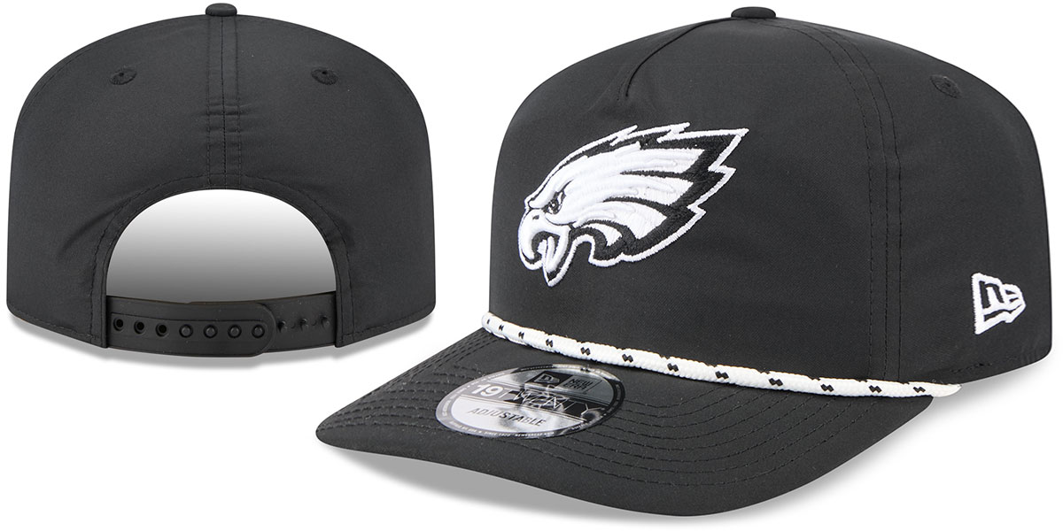 This 19TWENTY adjustable hat by New Era has a relaxed fit crown with pinched front panel construction and a mesh tray insert for light support. It has a poly nylon black crown and squared edge pre-curved visor with a black and white rope along brim. The undervisor is light grey, and the front sports a raised embroidered team logo in black and white. The side displays a matching embroidered New Era flag, and the back has an adjustable black rubber Snapback closure.. This Philadelphia Eagles hat is made by New Era and is licensed by the NFL - National Football League.