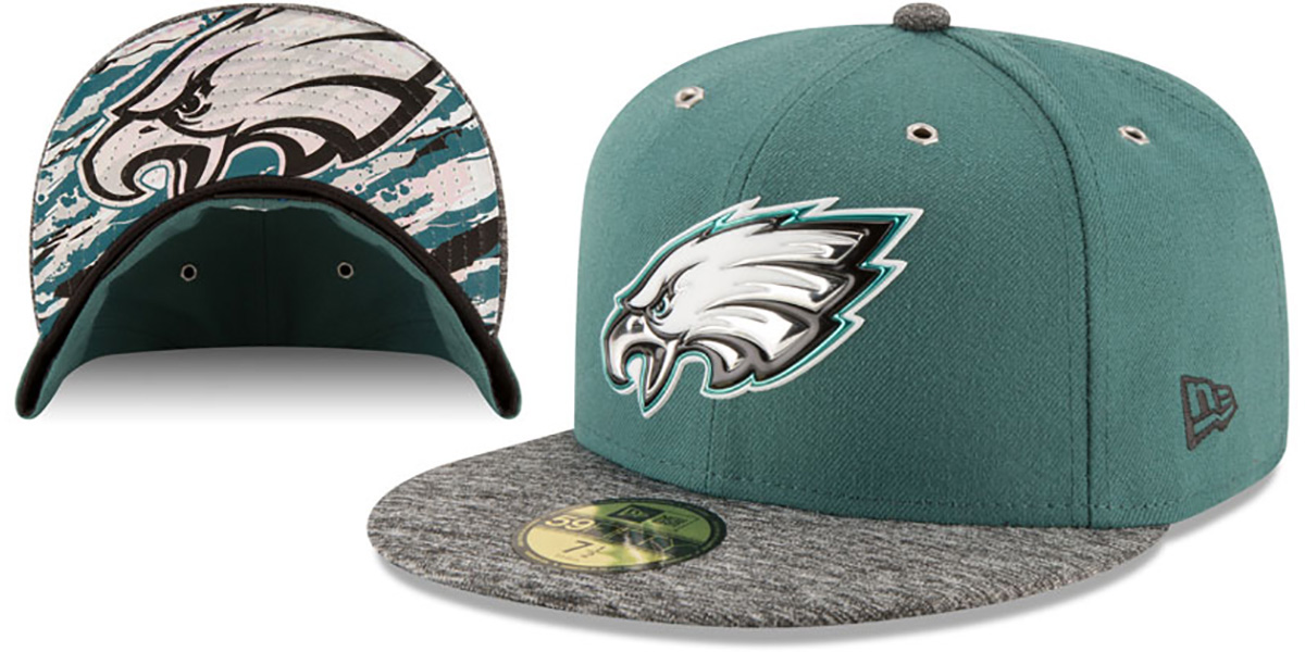 Authentic and ORIGINAL 59Fifty fitted hat by New Era, team color green authentic poly deep crown with dark heather grey visor, silver foil undervisor team logo and team color print, Liquid Chrome foil team logo on front, embroidered New Era logo on side, raised embroidered NFL shield logo on back, This is the 59FIFTY hat worn during the 2016 NFL Draft. This Philadelphia Eagles baseball cap is made by New Era and is licensed by the NFL National Football League.