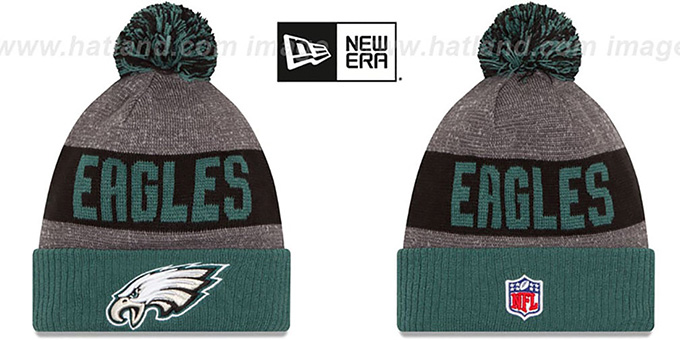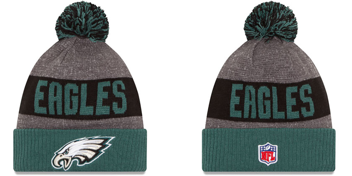 charcoal grey acrylic ribbed knit crown with team color stripe and team name on front and back of crown, embroidered team logo on front of team color green ribbed cuff, soft light grey poly/wool flannel liner, New Era Flag embroidery on side, embroidered NFL shield logo on back, matching 2 color pom-pom on top. This Philadelphia Eagles hat is made by New Era and is licensed by the NFL National Football League.