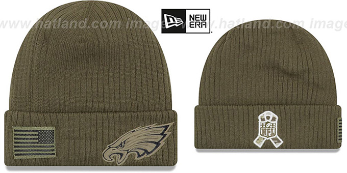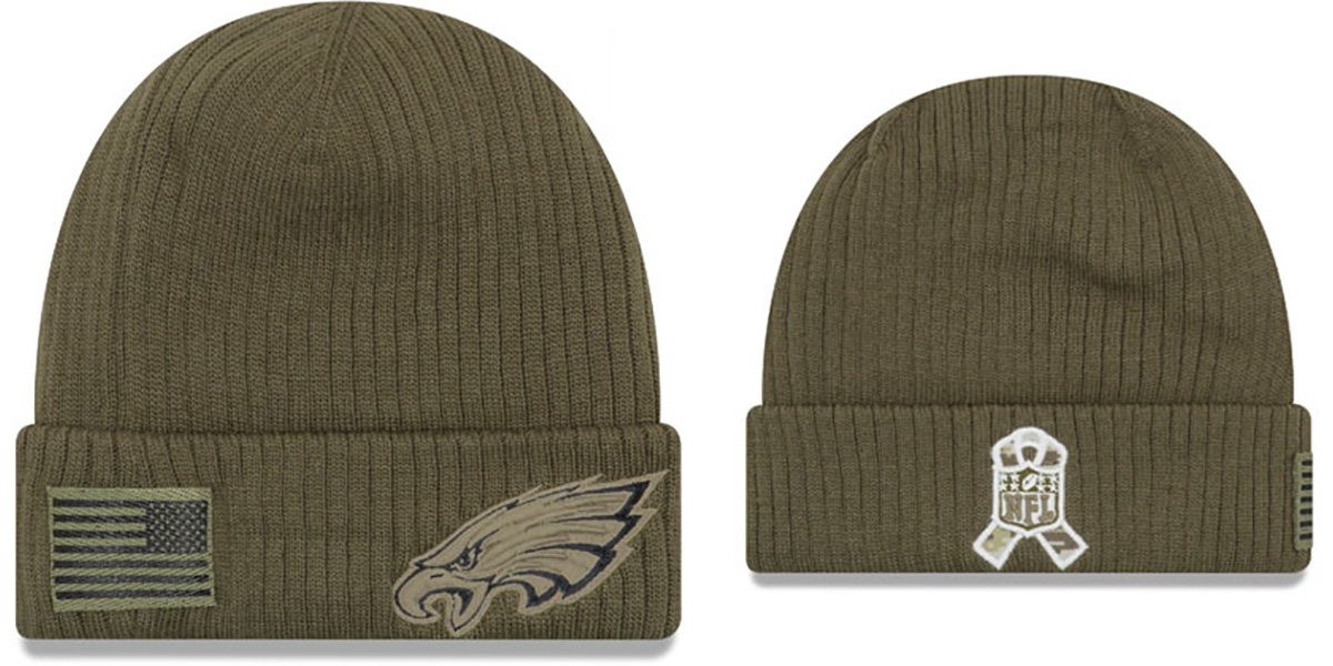 ribbed acrylic knit crown and cuff in olive (military) green, soft light grey poly liner, raised embroidered team logo on front in olive green and team color, New Era Flag embroidery on side, embroidered USA Flag applique on opposite side in olive and team color, matching embroidered NFL shield logo on back with digital camo military ribbon, no pom-pom on top , Adult size One Size Fits Most. This Philadelphia Eagles hat is made by New Era and is licensed by the NFL National Football League.