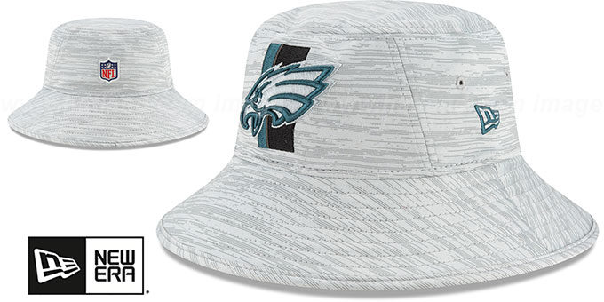 New Era bucket hat with heathered light grey performance poly/spandex crown and visor and edging along brim, team color green undervisor, raised embroidered team logo on front with embroidered vertical team stripes, embroidered New Era logo on side, raised embroidered NFL shield logo patch on back of flex bucket, black drawstring with clips that can be taken off if preferred Adult Sizing - One Size Fits Most - Approximate sizing 7 1/8 thru 7 5/8. This Philadelphia Eagles hat is made by New Era and is licensed by the NFL - National Football League.