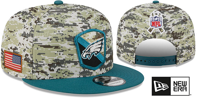 The New Era 9FIFTY poly hat features an authentic Desert Storm camouflage design. The crown has a desert camo pattern, while the visor is team-colored green. The undervisor also has a digital desert camo print. Raised green embroidery outlines a diagonal team logo above more desert camo. The side displays the embroidered New Era logo, and the opposite side has an embroidered USA flag patch. The rear showcases an embroidered NFL shield logo above a matching camo ribbon and team-colored snapback closure. This snapback style hat was worn by all NFL teams during the Salute to Service games, honoring the Armed Forces through patriotic themes that reflect the dedication of our troops. All proceeds from the NFL's Salute to Service campaign are donated to military appreciation nonprofits like the USO, Pat Tillman Foundation, and Wounded Warrior Project. Each camo hat pattern is slightly unique, so no two are exactly the same. This Philadelphia Eagles hat is made by New Era and is licensed by the NFL - National Football League.