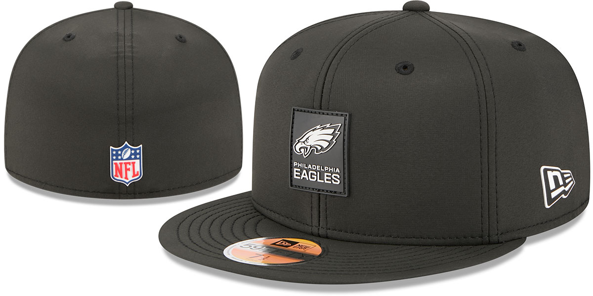 Thjis Authentic New Era 59FIFTY Fitted Hat is the official 2025 NFL Sideline cap worn by players, coaches, and staff. Crafted in lightweight black water-repellent Quill Tech fabric with a quick-dry cushioned sweatband for moisture control. Features a sewn-down silicone team logo patch on the front, team jersey stripe applique on the undervisor, silicone New Era flag on the side, and NFL Shield on the back.. This Philadelphia Eagles baseball cap is made by New Era and is licensed by the NFL- National Football League.