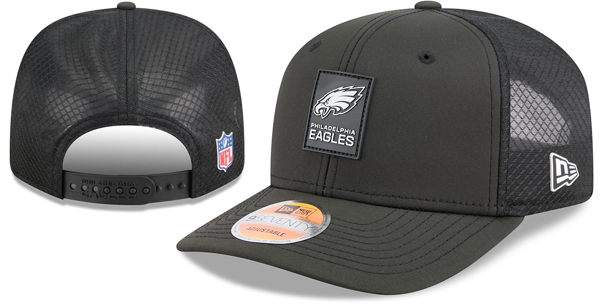 This Authentic New Era Low Profile 9SEVENTY Snapback is the official 2025 NFL Sideline cap worn by players, coaches, and staff. Designed with a structured black water-repellent Quill Tech crown, curved visor, and breathable mesh back panels. Features a quick-dry cushioned sweatband for comfort, silicone team logo patch on the front, jersey stripe applique under the brim, silicone New Era flag on the side, NFL Shield on the back, and an adjustable snapback closure.. This Philadelphia Eagles hat is made by New Era and is licensed by the NFL - National Football League.