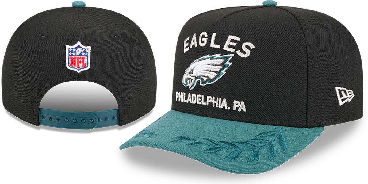 Original fit 9FIFTY A-Frame snapback hat by New Era that has deep 5-panel crown and slightly curved brim, black authentic poly crown with high-profile pinched front panels and team color green visor with tonal embroidered leaf pattern, light grey undervisor, embroidered team name with raised embroidered team logo on front, embroidered New Era logo on side, embroidered NFL shield logo on back above above team color snapback closure, The 9FIFTY A-FRAME SNAPBACK hat worn during the 2025 NFL Draft. This New York Jets hat is made by New Era and is licensed by the NFL - National Football League.