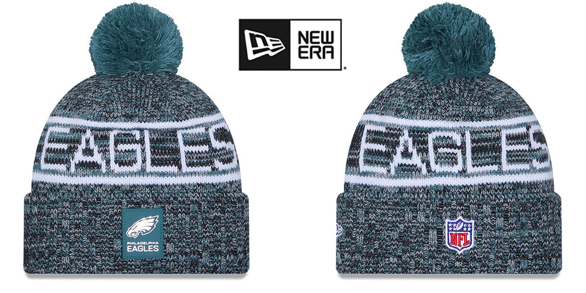 acrylic ribbed knit crown with team heathered team color pattern with team name and horizontal stripes, rubberized team logo patch on front with team logo and team name on cuff, soft light grey poly/wool flannel liner, New Era Flag embroidery on side, embroidered NFL shield logo on back, matching team color pom-pom on top. This Philadelphia Eagles hat is made by New Era and is licensed by the NFL - National Football League.