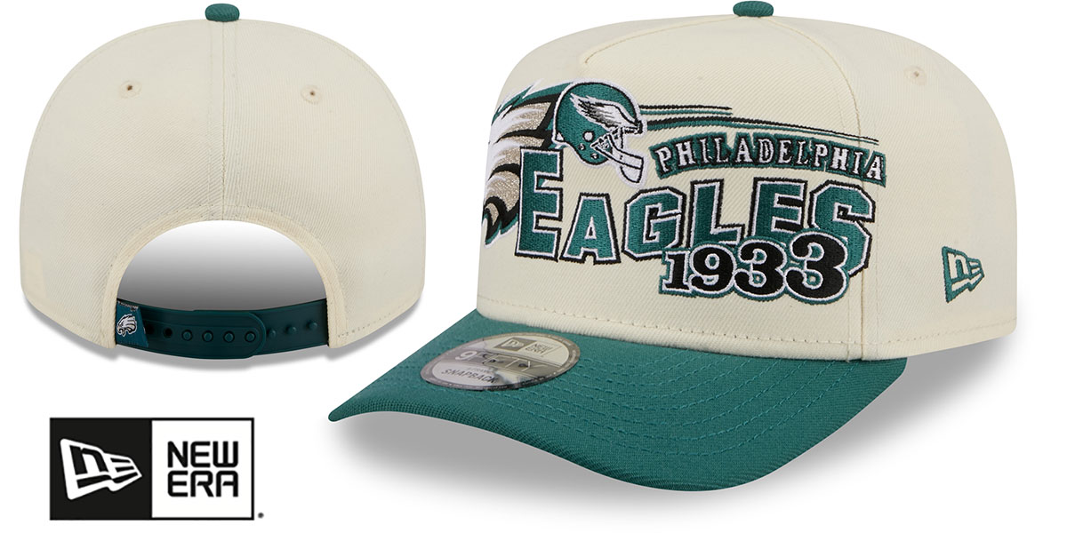 Adjustable A-FRAME five panel hat by New Era with pinched seam on front panels, chrome (cream) authentic poly crown and team color green visor with throwback dark kelly green undervisor, team classic logo flat embroidery on front across front panels, embroidered New Era logo on side, matching adjustable Snapback closure with team hangtag. This Philadelphia Eagles hat is made by New Era and is licensed by the NFL - National Football League.