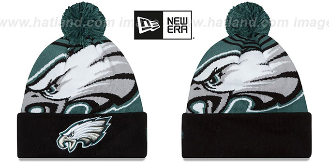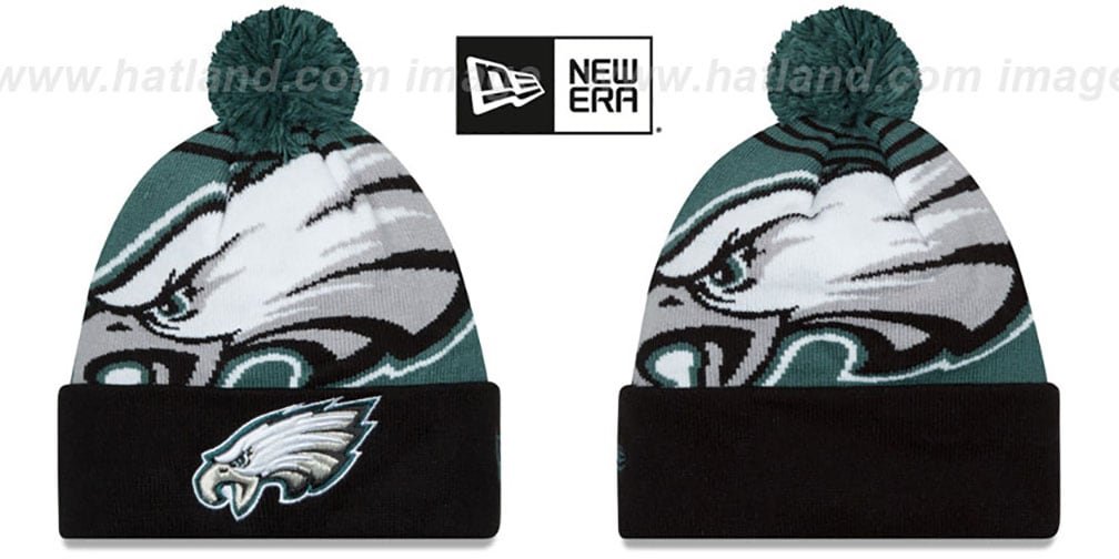 acrylic team color green knit beanie with black stripes on top and with black ribbed cuff, embroidered team logo on front of cuff, large matching woven team logo on crown, embroidered New Era Flag on side, matching team color pom-pom. This item is on SALE!. This Philadelphia Eagles hat is made by New Era and is licensed by the NFL National Football League.
