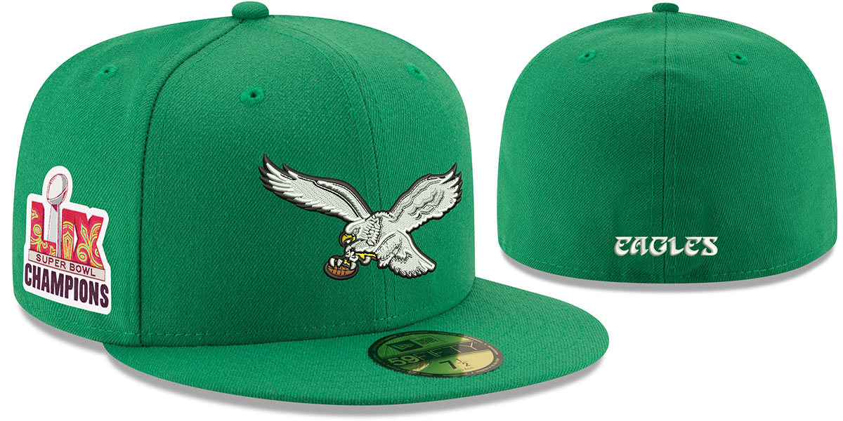 IN STOCK - NOW SHIPPING!!! Limited Quantities This authentic, officially licensed 59Fifty fitted cap by New Era features a deep kelly green crown and visor made of high-quality poly material. The undervisor is a light grey, and the front showcases a raised, embroidered Throwback team logo in the team's official colors. The side has a matching embroidered New Era logo, while the opposite side displays the official Super Bowl LIX Champions side patch for the 2024-2025 season. Completing the design is an embroidered secondary team font logo on the back. This Philadelphia Eagles hat is made by New Era and is licensed by the NFL - National Football League.