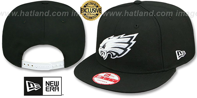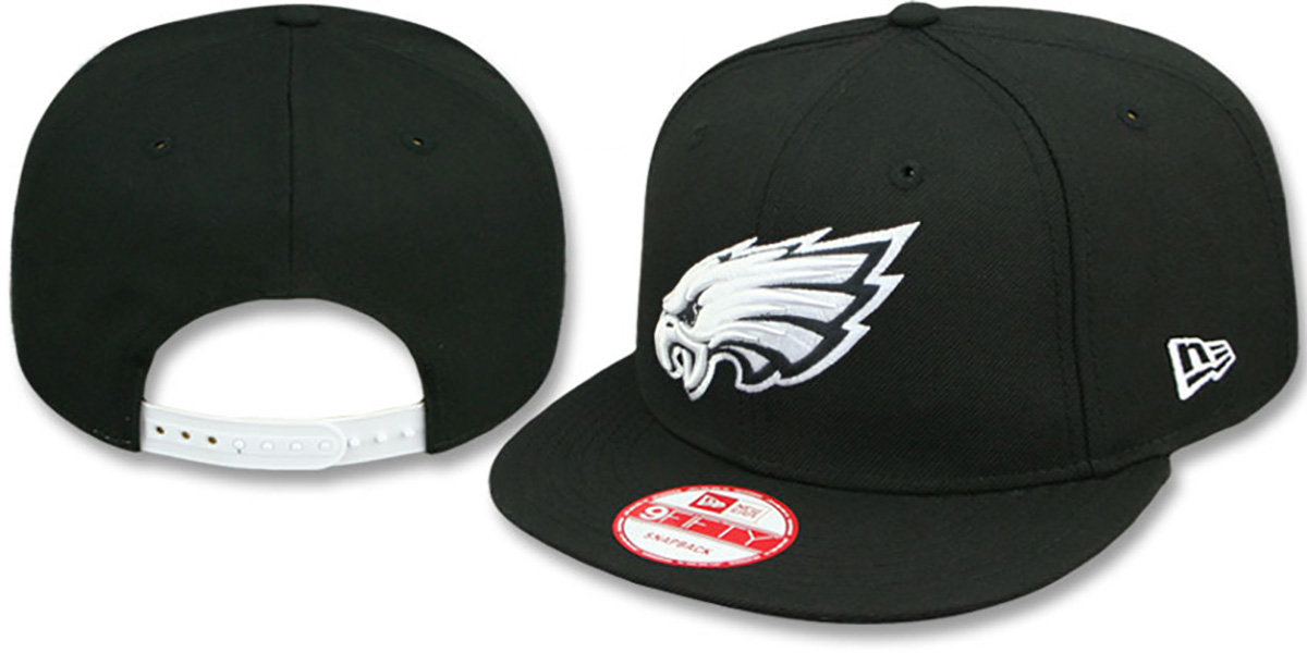 Original fit 9FIFTY adjustable wool hat by New Era that has similar deep crown and flat brim fit as the 59-Fifty, black crown and visor, light grey undervisor, raised embroidered team logo on front in black and white, embroidered New Era flag on side in white, white adjustable Snapback strap closure (some have black Snapback strap closure) . This Philadelphia Eagles hat is made by New Era and is licensed by the NFL - National Football League.