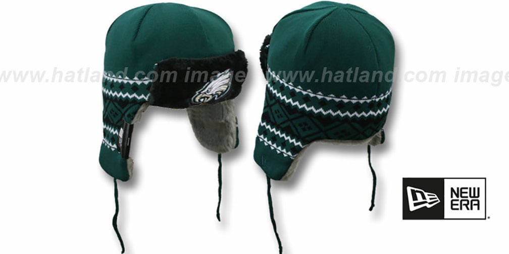 Team color green ribbed knit crown with opposite team color pattern on ear flaps, embroidered team logo on front fur flip, grey fur lining, matching draw strings. This Philadelphia Eagles hat is made by New Era and is licensed by the NFL National Football League.