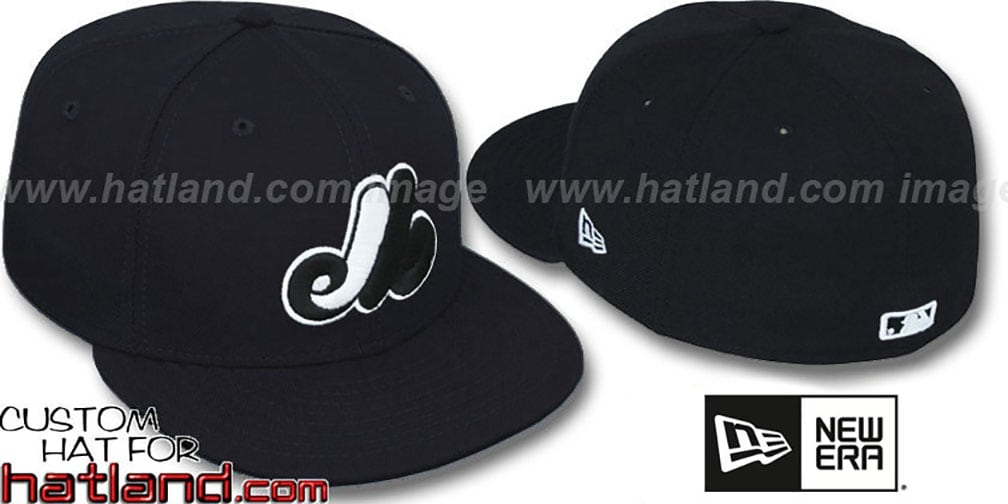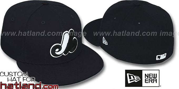 Authentic and ORIGINAL 59FIFTY fitted hat by New Era, black wool deep crown and visor, black and white raised embroidered team logo on front, matching MLB logo on back. This Montreal Expos baseball cap is made by New Era and is licensed by the MLB - Major League Baseball.
