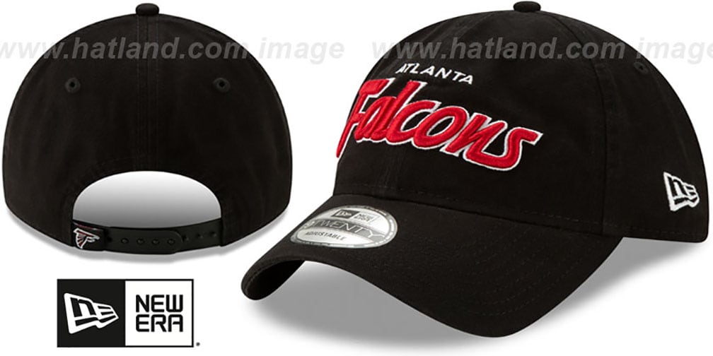 Low Profile 9TWENTY slouch fit trucker hat by New Era, black soft washed cotton twill lightly structured rounded crown and visor, black undervisor, embroidered city name above raised embroidered team script on front with white outline, New Era flag on side, matching adjustable Snapback strap on back with team logo hangtag. This Atlanta Falcons hat is made by New Era and is licensed by the NFL - National Football League.