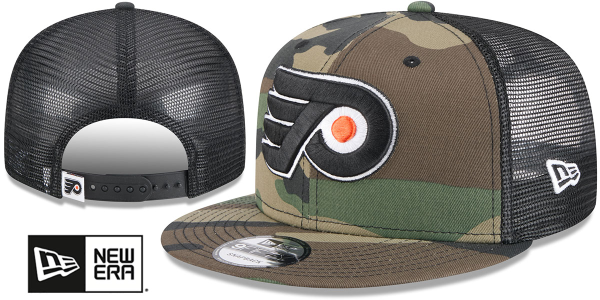 Original 9FIFTY fit adjustable poly meshback hat by New Era that has similar deep crown and flat brim fit as the 59-Fifty, army (woodland) camo cotton front panels and visor with black mesh middle and back panels, light grey undervisor, raised embroidered team logo on front in team colors, embroidered white New Era logo on side, black adjustable snapback closure with team logo hangtag. This Philadelphia Flyers hat is made by New Era and is licensed by the NHL - National Hockey League.