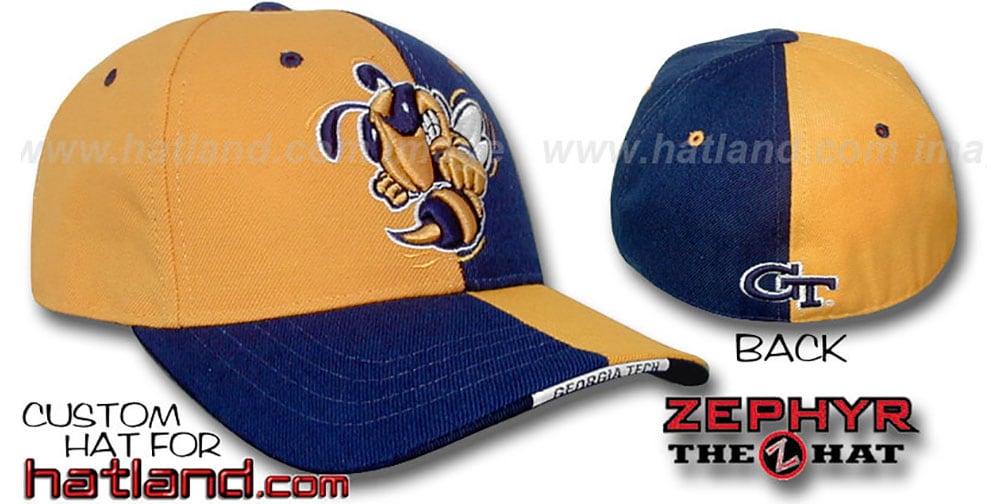 Vibrant and stylish, this structured hat boasts a rounded crown crafted from a wool blend. The crown is split in half, with one side shimmering in gold and the other in a rich navy blue. The visor matches this eye-catching color scheme, divided down the center into the contrasting hues. Adding to the dynamic design, a Bee logo is embroidered on the front, while the team name graces the front tip of the brim. And to complete the look, the team logo is proudly displayed on the back. This Georgia Tech Yellow Jackets hat is made by Zephyr and is licensed by the NCAA College.