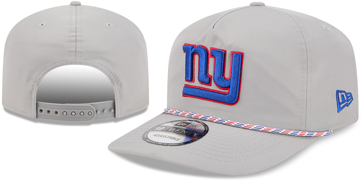 This 19TWENTY adjustable hat by New Era has a relaxed fit crown with pinched front panel construction and a mesh tray insert for light support. It has a poly nylon light grey crown and squared edge pre-curved visor with a team color rope along brim. The undervisor is light grey, and the front sports a raised embroidered team logo in team colors. The side displays a matching embroidered New Era flag, and the back has an adjustable light grey rubber Snapback closure.. This New York Giants hat is made by New Era and is licensed by the NFL - National Football League.