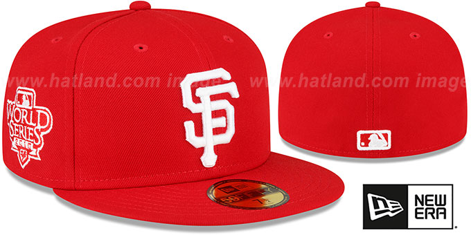 Authentic and ORIGINAL 59FIFTY fitted hat by New Era, red authentic poly crown and visor, light grey undervisor, black sweatband, raised embroidered team logo on front, embroidered 2010 WORLD SERIES logo side-patch on side in red and white, embroidered New Era logo on opposite side, matching raised embroidered MLB logo on back. This San Francisco Giants baseball cap is made by New Era and is licensed by the MLB - Major League Baseball.