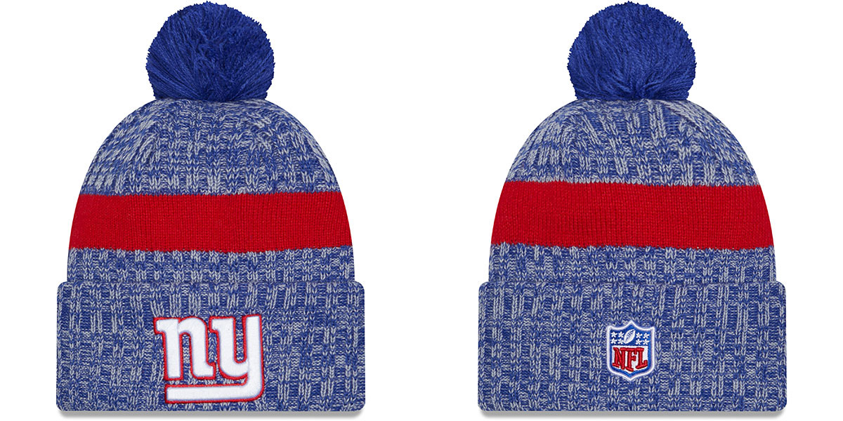 acrylic ribbed knit heather royal blue and grey crown and cuff with team color stripes, raised embroidered team logo on cuff, soft light grey poly/wool flannel liner, New Era Flag embroidery on side, raised embroidered NFL shield logo on back in team colors, matching team color pom-pom on top, This is the Official sideline knit beanie that will be worn by coaches and players on the sideline throughout the 2023 NFL season. This New York Giants hat is made by New Era and is licensed by the NFL National Football League.