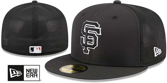 MLB Authentic Collection and ORIGINAL 59FIFTY fitted nylon poly hat by New Era, black nylon crown and visor with black batting practice lightweight performance mesh middle and back panels, black undervisor, raised embroidered team logo on front, embroidered New Era logo on side, raised embroidered MLB logo on back in team colors, This is the style of Onfield Batting Practice hat worn by MLB teams during the 2026 MLB season. This San Francisco Giants baseball cap is made by New Era and is licensed by the MLB - Major League Baseball.