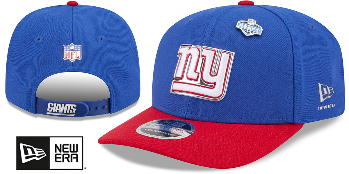 This New Era Low Profile 9SEVENTY STRETCH SNAP hat features a royal blue rounded crown with red slightly precurved visor and 2026 NFL Draft pin on crown, light grey undervisor, team inspired print on inside front panels, embroidered team logo on front with liquid chrome outline, liquid chrome New Era logo on side, liquid chrome NFL shield logo on back above team color snap with team name in liquid chrome, This is the 9SEVENTY stretch snapback style of hat worn by all NFL players during the 2026 NFL Draft. This New York Giants hat is made by New Era and is licensed by the NFL - National Football League.