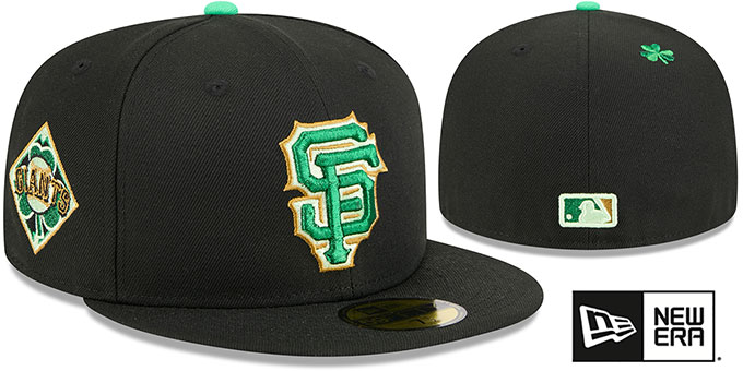 Authentic and ORIGINAL 59FIFTY fitted hat by New Era, black authentic poly crown and visor, black undervisor, green and black plaid inside crown on front panels, raised embroidered team logo on front in kelly green, gold and off white, matching embroidered diamond side patch with team logo and shamrock print, matching embroidered New Era logo on opposite side, kelly green embroidered shamrock on backside top of crown, matching raised embroidered MLB logo on back, This is the style of On-field hat worn by all MLB teams in the 2026 ST PATRICKS DAY games. This San Francisco Giants baseball cap is made by New Era and is licensed by the MLB - Major League Baseball.
