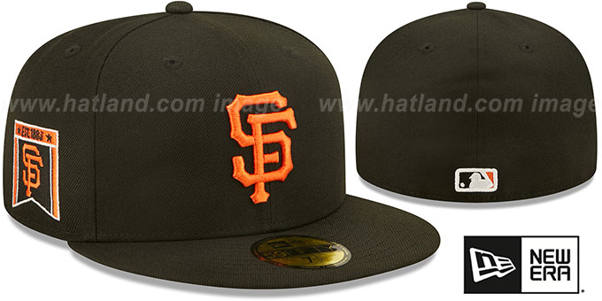 Authentic and Original 59Fifty fitted hat by New Era, black authentic poly crown and visor, light grey undervisor, black sweatband, raised embroidered team logo on front, embroidered banner side-patch on side with team logo and established date on side in team colors, embroidered New Era logo on opposite side, matching raised embroidered MLB logo on back . This San Francisco Giants hat is made by New Era and is licensed by the MLB - Major League Baseball.