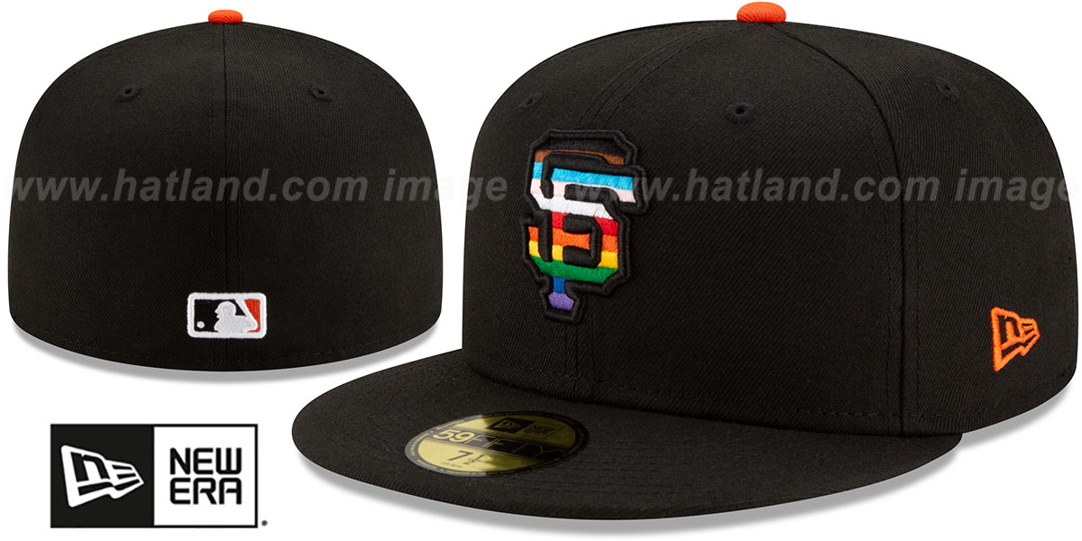 Authentic and ORIGINAL 59FIFTY fitted hat by New Era, black authentic onfield poly deep crown and visor, black undervisor, raised embroidered San Francisco Giants team logo on front with embroidered rainbow stripes fill, embroidered New Era logo on side, raised embroidered MLB logo on back This is the hat worn during the 2021 season TURN-BACK-THE-CLOCK game. This San Francisco Giants baseball cap is made by New Era and is licensed by the MLB - Major League Baseball.