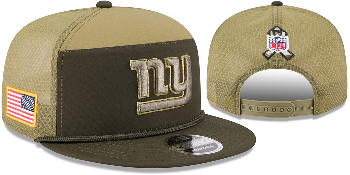 Show your support with the Giants 2025 Salute to Service Split Panel 9FIFTY Trucker. This 100% Quill Tech polyester fabric cap features an embroidered team logo on the front, an NFL Salute to Service patch above the adjustable snapback closure, and an American flag patch on the right side. Rope embellishment extends across the visor. Finished with a silicone team logo on the dark green undervisor, while digi-camo fabric lines the interior for a bold finish. Proceeds from Salute to Service products benefit the NFL’s military nonprofit partners. This New York Giants hat is made by New Era and is licensed by the NFL - National Football League.
