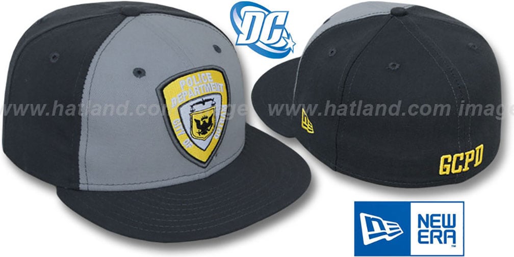'Authentic' and Original 5950 fitted hat by New Era, light grey wool blend fromt panels with charcoal grey lid and back panels, charcoal undervisor, raised embroidered Gotham City Police Department 'Shield' logo on front, matching 'GCPD' embroidery on back, officially licensed DC Comics hat produced by New Era Superhero Collection for the Batman Dark Knight Movie. Makes a great Halloween hat too!. This DC Comics hat is made by New Era.