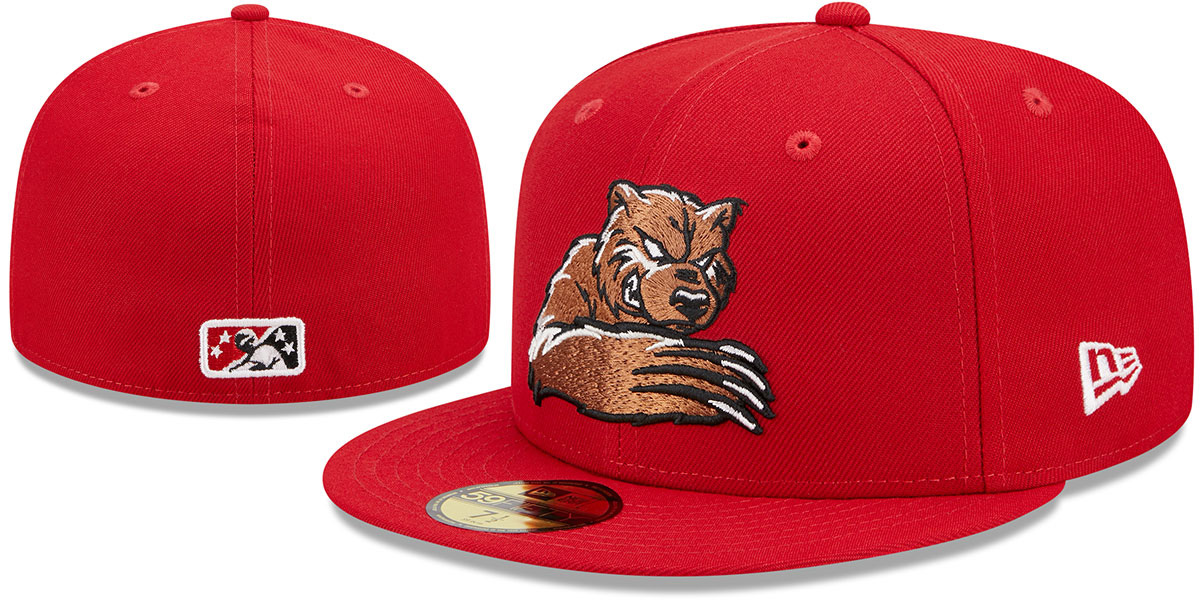 Authentic and ORIGINAL 59FIFTY onfield poly fitted hat by New Era, red deep crown and visor, black undervisor, embroidered Fresno Grizzlies Minor League Marvel DEFENDERS OF THE DIAMOND team logo on front, New Era logo on side, matching raised embroidered MiLB Minor League logo on back. This Fresno Grizzlies baseball cap is made by New Era and is licensed by the MiLB - Minor League Baseball.