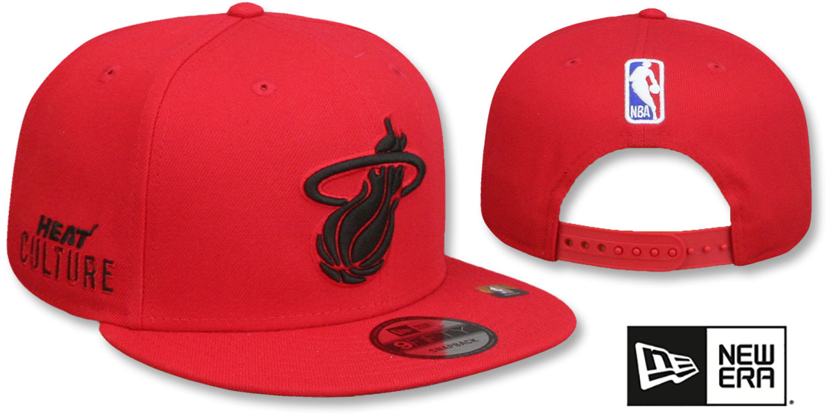 Original fit 9FIFTY adjustable hat by New Era that has similar deep crown and flat brim fit as the 59-Fifty, red authentic poly crown and visor, light grey undervisor, raised embroidered City Edition logo on front, embroidered New Era logo on side, matching embroidered City Edition design logo on opposite side, raised embroidered NBA logo on back in white with red and royal fill over matching snapback closure, Produced to match NBA City Edition Jerseys worn throughout select 2024-2025 games. This Miami Heat hat is made by New Era and is licensed by the NBA - National Basketball Association.