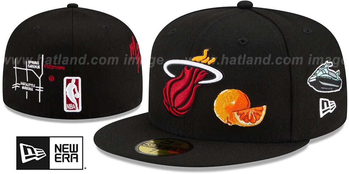 Authentic and Original 59FIFTY fitted hat by New Era, black authentic poly and visor, light grey undervisor, raised embroidered team logo on front with state icon, New Era embroidered logo on side with transportation representation, embroidered city/state nickname above logo, raised embroidered NBA logo with embroidered city street map. This Miami Heat baseball cap is made by New Era and is licensed by the NBA - National Basketball Association.