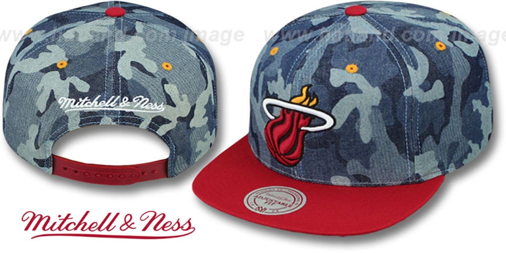 Authentic cotton/wool blend adjustable hat by Mitchell & Ness with original cut and flat brim, 4 color blue denim crown and team color red visor, spuce green undervisor, raised embroidered team logo on front, embroidered Mitchell & Ness logo on back above adjustable matching plastic Snapback strap. This item is on SALE!. This item is on SALE!. This Miami Heat hat is made by Mitchell & Ness and is licensed by the NBA - National Basketball Association.