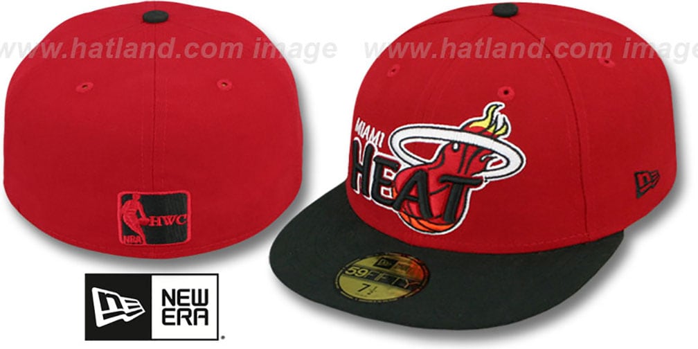Authentic and ORIGINAL 59FIFTY 100% performance high tech polyester fitted hat by New Era, team color red deep crown with black visor, light grey undervisor, embroidered city name over raised embroidered team name with team logo on front, embroidered team logo on side, raised embroidered HWC logo on back. This item is on SALE!. This Miami Heat baseball cap is made by New Era and is licensed by the NBA - National Basketball Association.