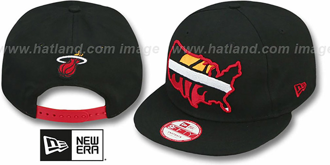 Original 9FIFTY fit adjustable cotton twill hat by New Era that has similar deep crown and flat brim fit as the 59-Fifty, black crown and visor with team color undervisor, raised embroidered USA Insider logo on front with partial team logo inside the USA outline, New Era logo on side, embroidered team logo on back, team color plastic adjustable Snapback strap. This item is on SALE!. This Miami Heat hat is made by New Era and is licensed by the NBA - National Basketball Association.