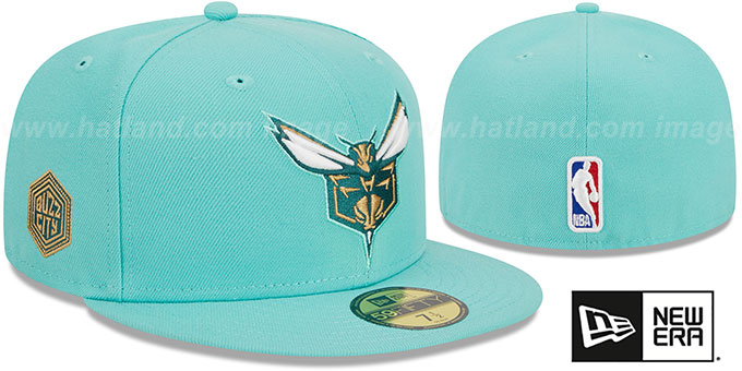 Authentic and ORIGINAL 59Fifty fitted hat by New Era, teal authentic poly crown and with multi colored print teal side panels and old gold (tan) visor, light grey undervisor, raised embroidered Alternate City Edition logo on front, embroidered New Era logo on side, matching embroidered City Edition design logo on opposite side, raised embroidered NBA logo on back in white with red and royal fill, Produced to match NBA City Edition Jerseys worn throughout select 2023-2024 games. This Charlotte Hornets hat is made by New Era and is licensed by the NBA - National Basketball Association.