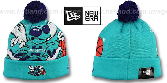 100% acrylic team color teal knit beanie with ribbed cuff, embroidered team logo on front of cuff, large matching printed team logo on crown, embroidered New Era Flag on side, opposite team color pom-pom. This item is on SALE!. This Charlotte Hornets hat is made by New Era and is licensed by the NBA - National Basketball Association.