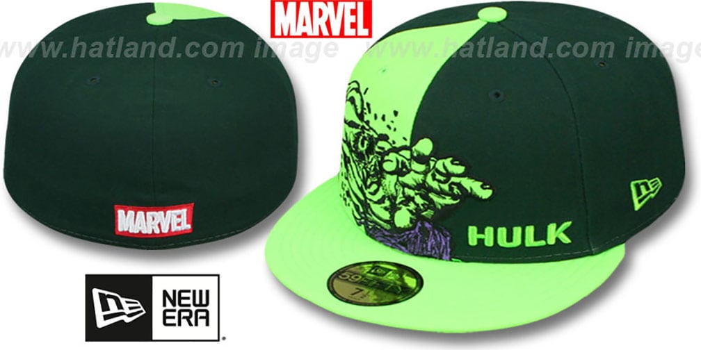 Authentic and Original 59FIFTY authentic poly fitted hat by New Era, dark green deep crown with lime green side front panel, lime green visor and undervisor, large embroidered Hulk image on side front and raised HULK embroidered on opposite front panel, MARVEL embroidery on back, Officially licensed Marvel hat produced by New Era Superhero Collection. This Marvel Comics baseball cap is made by New Era.
