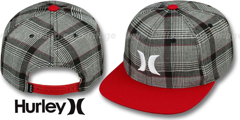 Regular profile and structured poly/rayon blend plaid crown with red visor, undervisor and top button. Raised Hurley H on front. Adjustable red plastic snap back closure fits most . This item is on SALE!. This item is on SALE!. This hat is made by Hurley.