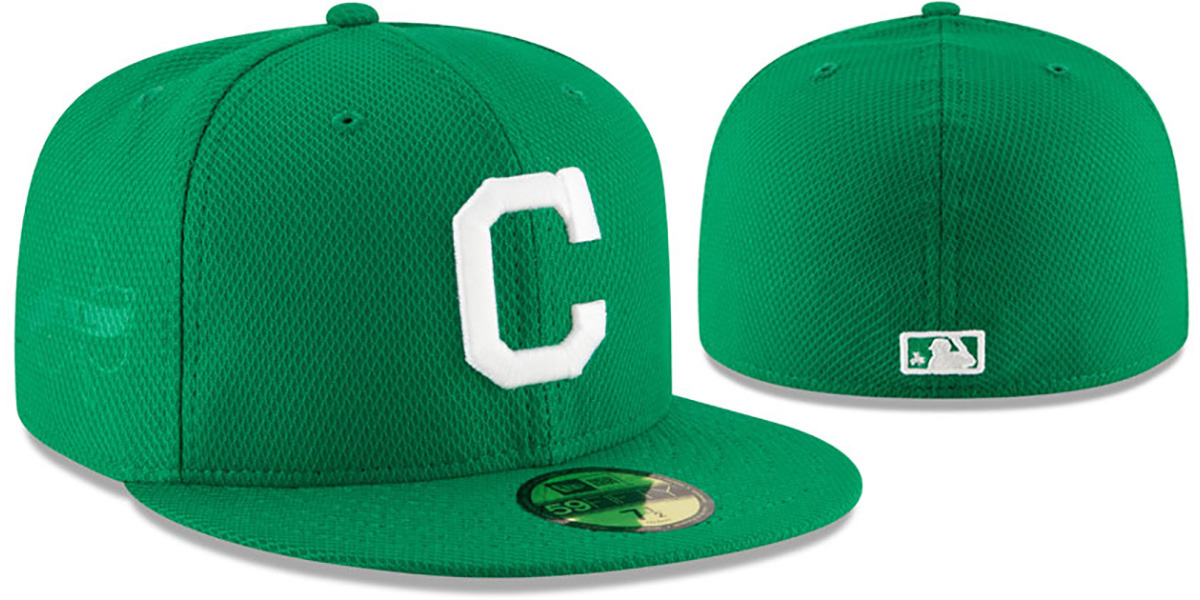 Authentic and ORIGINAL 59FIFTY fitted diamond tech batting practice poly hat by New Era, kelly green deep crown and visor with light grey undervisor, raised embroidered team logo on front, Shamrock and AL print on side panel, matching raised embroidered MLB logo on back with shamrock inside logo, This is the style of On-field hat worn by all MLB teams played on March 17, 2016. This Cleveland Indians baseball cap is made by New Era and is licensed by the MLB - Major League Baseball.