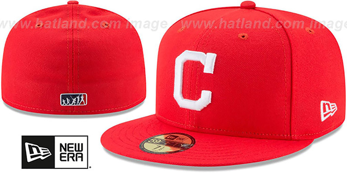 MLB Authentic and ORIGINAL 59FIFTY fitted performance poly hat by New Era, Neon Red authentic poly deep crown and visor, light grey undervisor, raised embroidered team logo on front, embroidered New Era logo on side, Little League embossed liquid chrome logo on back, This is the fitted hat worn during 2017 Little League MLB games in August 2017 and is a collaboration between MLB and Little League. This Cleveland Indians baseball cap is made by New Era and is licensed by the MLB - Major League Baseball.