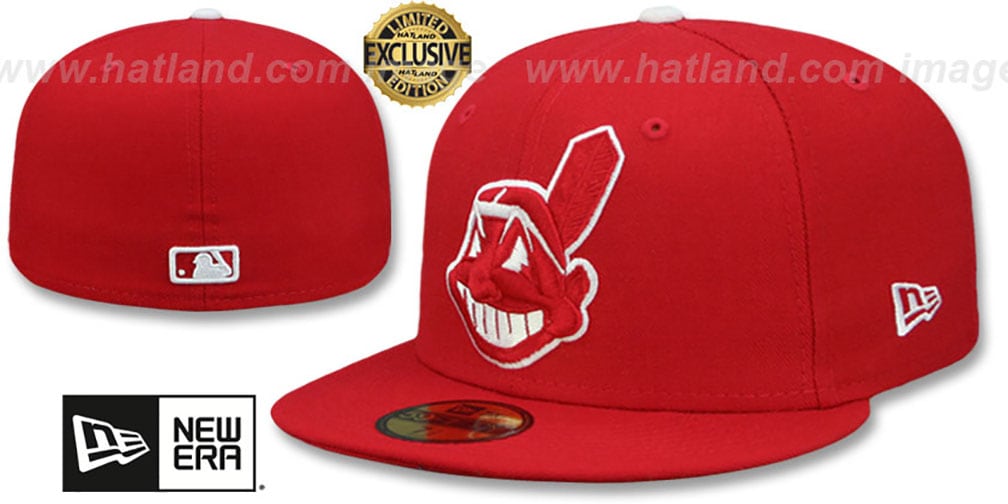 Authentic and ORIGINAL 59FIFTY fitted hat by New Era, red wool deep crown and visor and undervisor, raised embroidered team logo on front in white and red, embroidered New Era logo on side, matching MLB logo on back in white and red. This Cleveland Indians baseball cap is made by New Era and is licensed by the MLB - Major League Baseball.