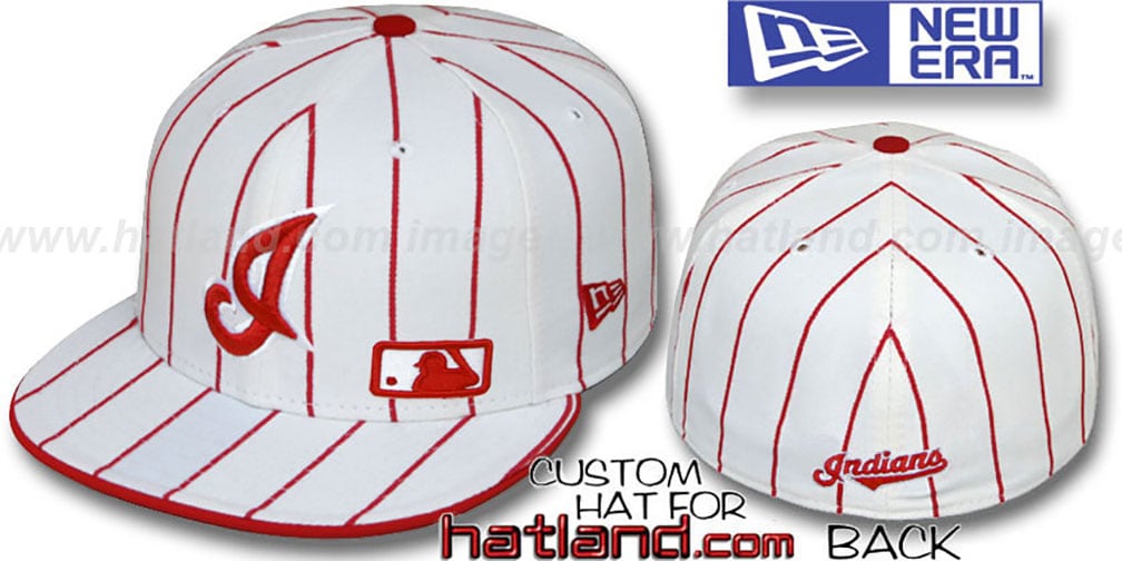 'Authentic' and Original 59FIFTY fitted hat, white cotton deep crown and visor with red pinstripes, matching red and white raised embroidered Alternate team logo on front with small raised 'Flawless' MLB logo, script matching team logo on back. This Cleveland Indians baseball cap is made by New Era and is licensed by the MLB - Major League Baseball.
