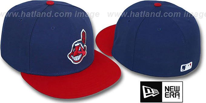 'Authentic Collection' and 'Original' 59FIFTY fitted 100% Worsterlon polyester hat by New Era, navy blue deep crown and red visor with the new high tech fabric that has revolutionary wicking ability, superior drying, and is shrink resistant, black undervisor to reduce glare, embroidered team logo on front, MLB logo on rear of hat. This is the style of On-field hat worn by all MLB teams during the regular season. This Cleveland Indians baseball cap is made by New Era and is licensed by the MLB - Major League Baseball.