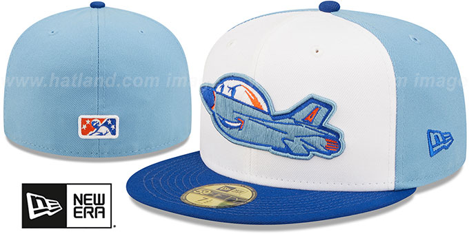 Authentic and ORIGINAL 59FIFTY onfield poly fitted hat by New Era, sky blue crown with white front panels and royal blue visor, black undervisor, embroidered Aberdeen IronBirds Minor League onfield team logo on front, New Era logo on side, matching raised embroidered MiLB Minor League logo on back, These hats are the Authentic Onfield hats worn during Minor League games, they are a Minor League affiliate of the Baltimore Orioles. This Aberdeen IronBirds baseball cap is made by New Era and is licensed by the MiLB - Minor League Baseball.